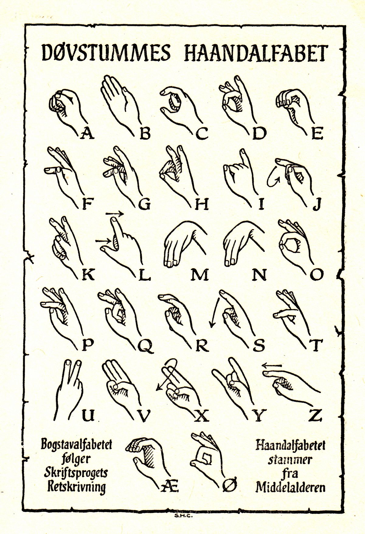 Det gamle håndalfabet blev introduceret i 1808. Håndalfabetet adskiller sig fra det nuværende håndalfabet på en række måder. Generelt er fingrene mere spredte i det gamle håndalfabet, som det fx kan ses i d’et, g’et, s’et og t’et, i forhold til det nuværende håndalfabet hvor hånden er mere samlet. I det gamle håndalfabet er bevægelsesretningen vertikal, dvs. at man bevæger hånden op- og nedad, mens den i det nuværende håndalfabet er horisontal, dvs. at man bevæger hånden sideværts – til højre hvis man er højrehåndet, eller til venstre hvis man er venstrehåndet. Se billedet af det gamle håndalfabet nedenfor.
