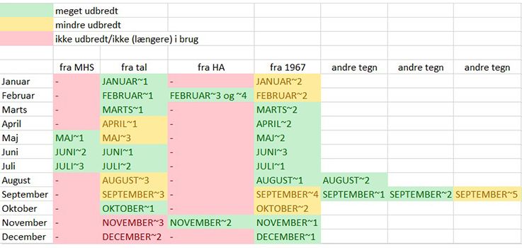 MHS og HA i oversigten står for hhv. mund-hånd-systemet og håndalfabetet. Når det er angivet at maj, juni og juli bl.a. siges med tegn fra MHS og februar og november med tegn fra HA, er der altså tale om afledninger af hhv. tegnene for konsonanternes lyde i MHS og tegnene for bogstaverne i HA.