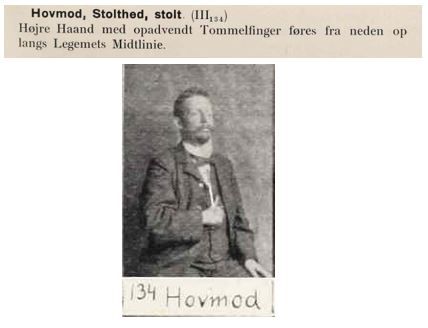 I tegnordbogen fra 1926 er der udover en lignende beskrivelse af håndform og bevægelse tilføjet en beskrivelse af mimik og kropsholdning: Kinderne pustes op, og Ryggen rettes. I denne udgivelse præsenteres tegnene for hovmod og vigtig med samme udførsel.